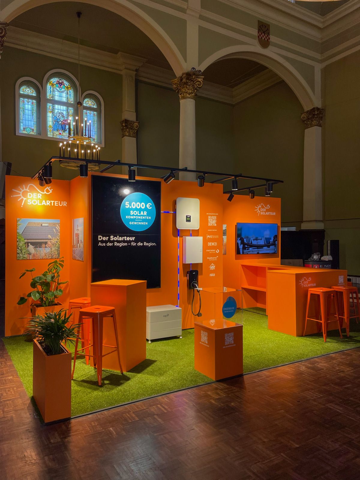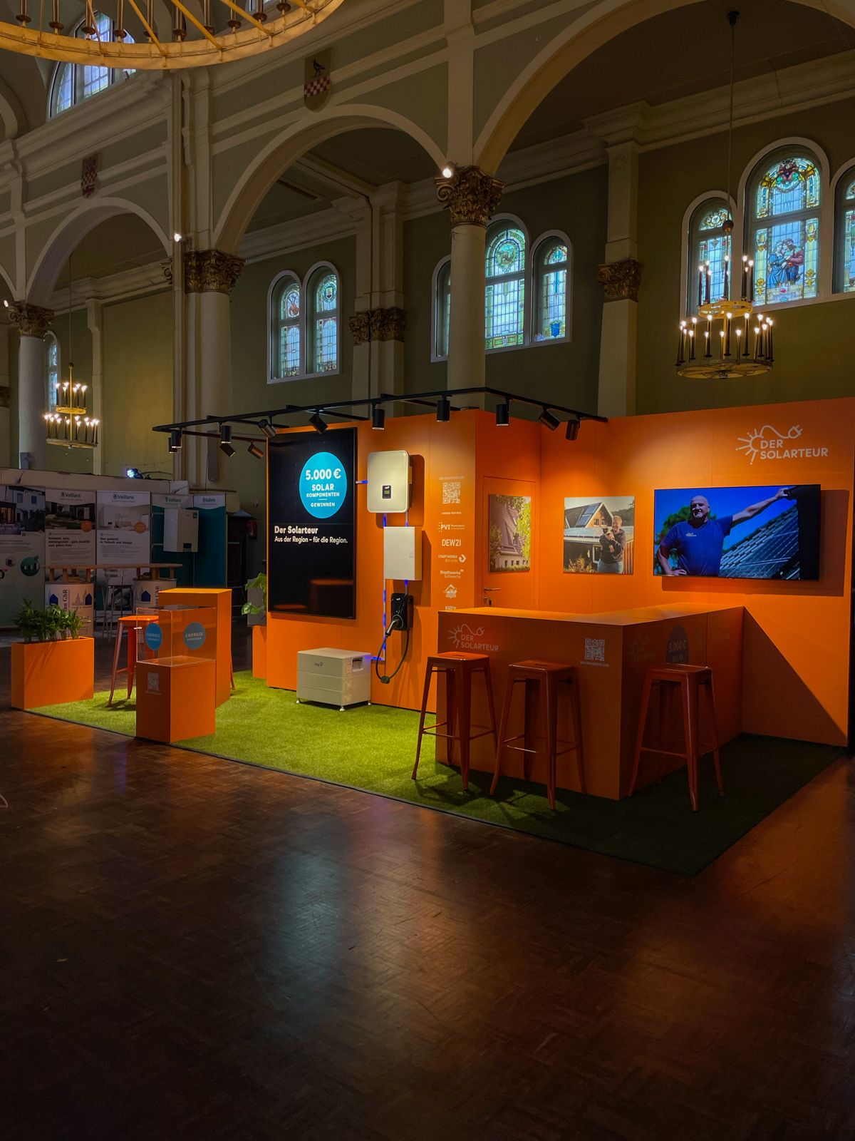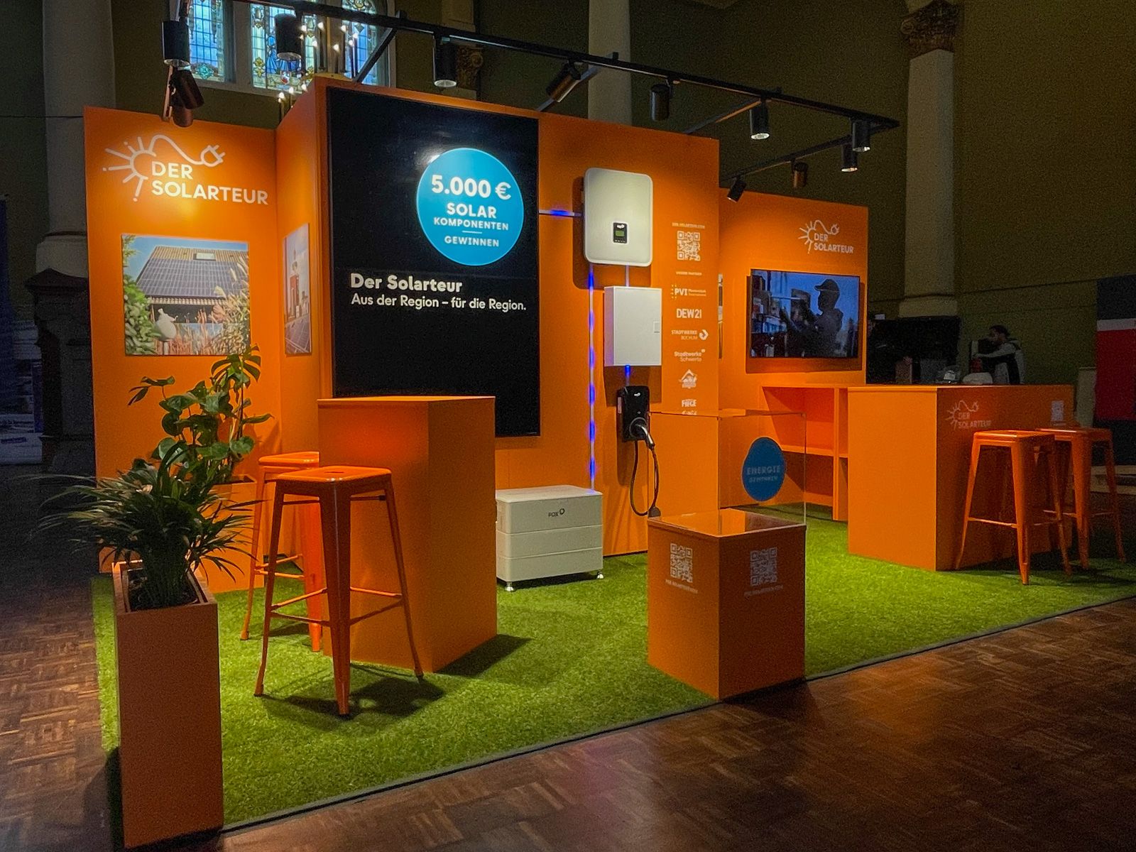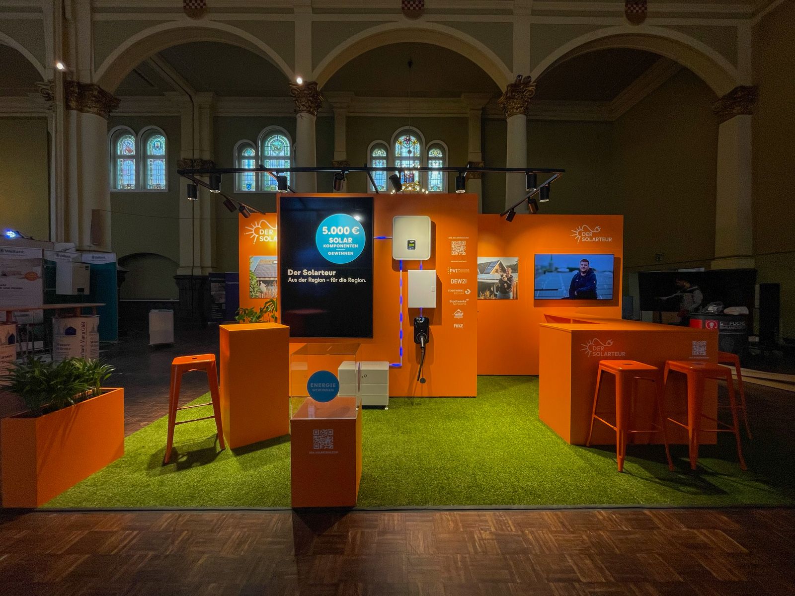 Der leuchtend orangene Messestand für den PV-Installateur aus Dortmund sollte nicht nur ein farblicher Hingucker sein, sondern auch flexibel anpassbar und damit wiederverwendbar gestaltet werden.