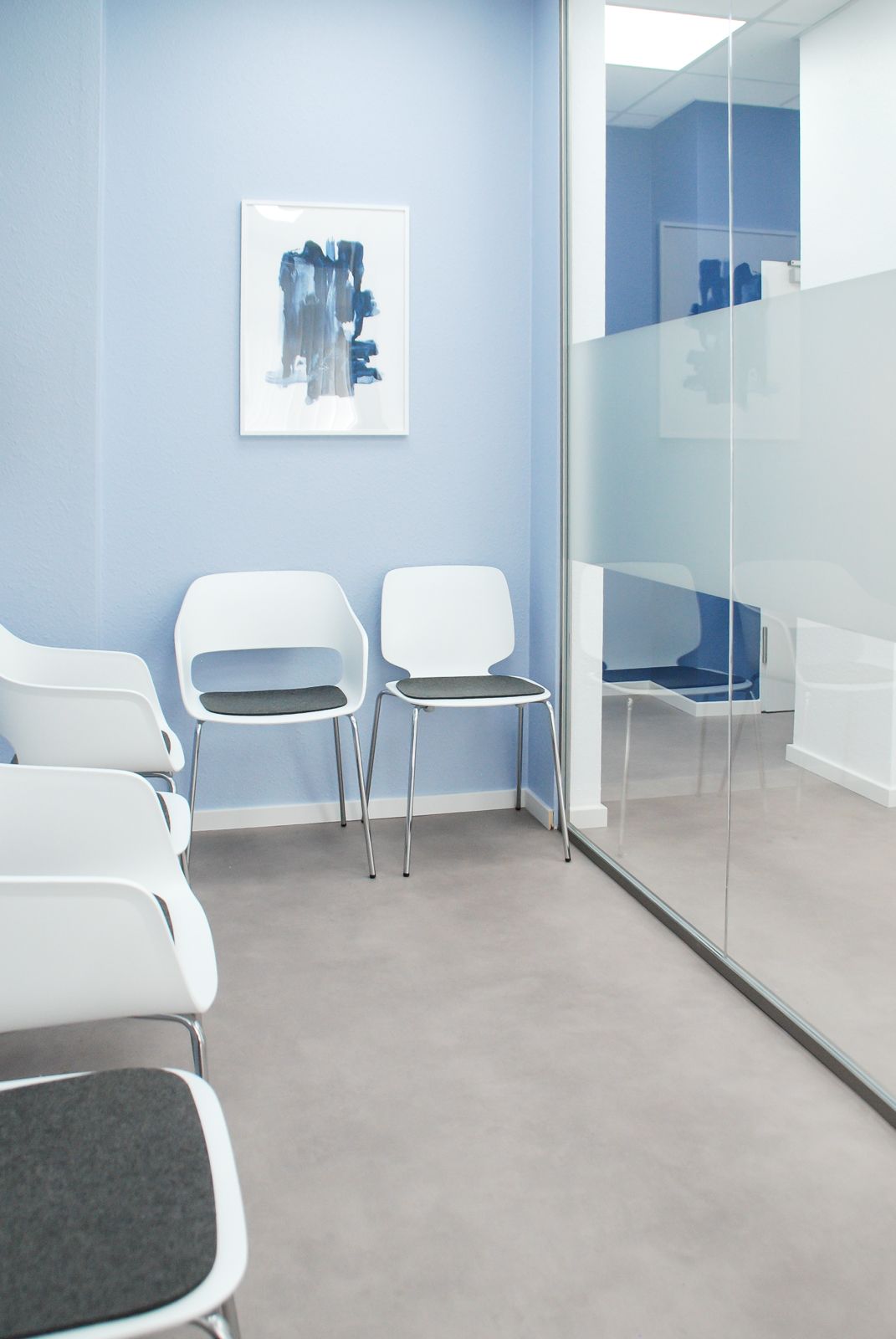 Der Empfang wurde mit zwei vollwertigen Arbeitsplätzen und viel Stauraum neu organisiert, ohne an Übersichtlichkeit zu verlieren. Der Wartebereich erhielt eine verglaste Abtrennung, die für mehr Diskretion sorgt. Ein durchgehender Vinylboden in heller Betonoptik ersetzt die alten Fliesen und lässt die Praxis leichter wirken. Und auch die Sprech- und Behandlungsräume zeigen sich jetzt klar, ruhig und funktional aufgeräumt.